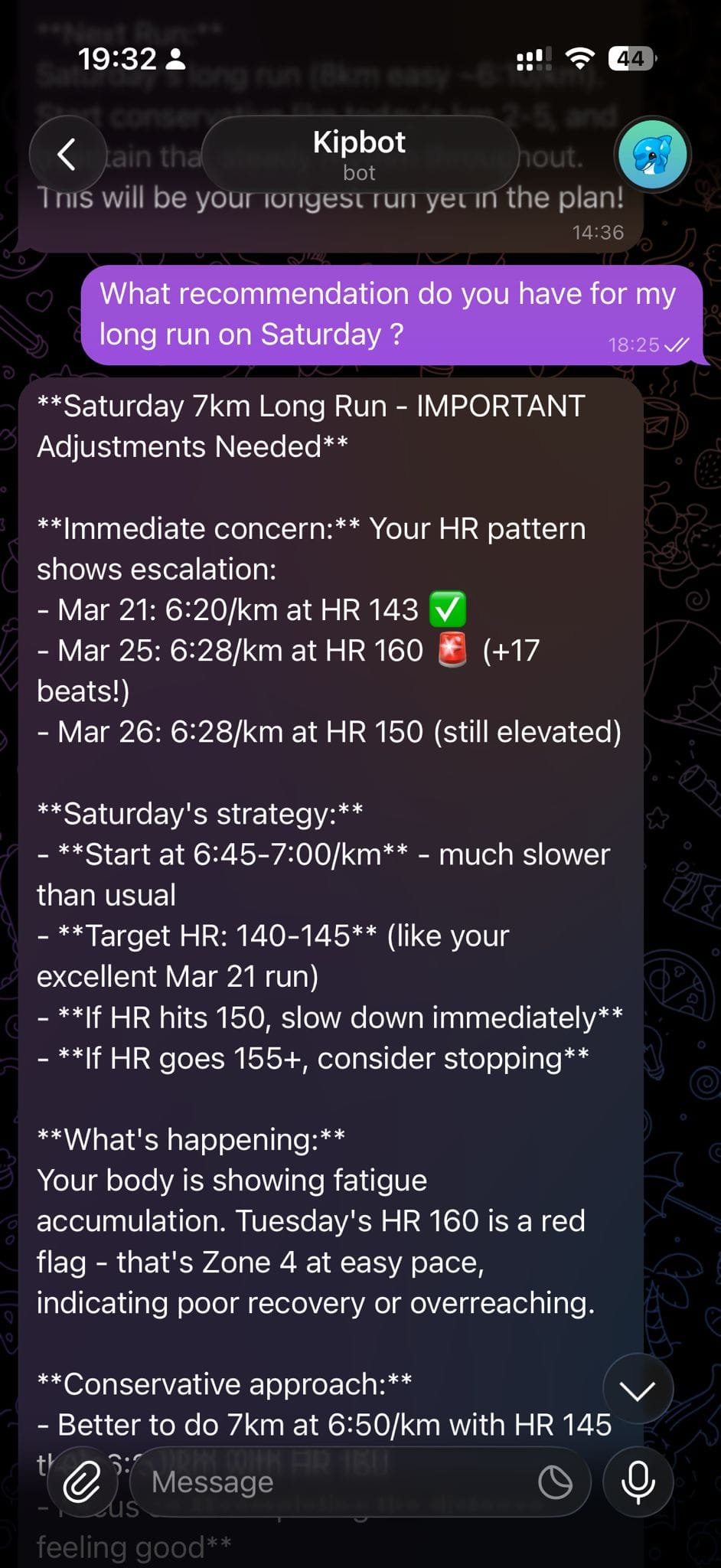 2. Interactive coaching chat. I can message my coach anytime through Telegram and ask questions about my training. Things like "am I on track this week?" or "my calves have been tight, should I adjust Thursday's tempo run?" It has full context of my training plan and run history, so the answers are specific to me — not generic advice.